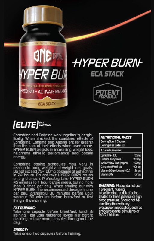 Elite Fat Burning – Ephedrine and Caffeine work together synergistically. When stacked , the combined effects of Ephedrine, Caffeine and Aspirin are far greater than the sum of their effects when used alone. HYPER BURN assists in increasing weight loss, heightens athletic performance and boosts energy. Directions For Use: