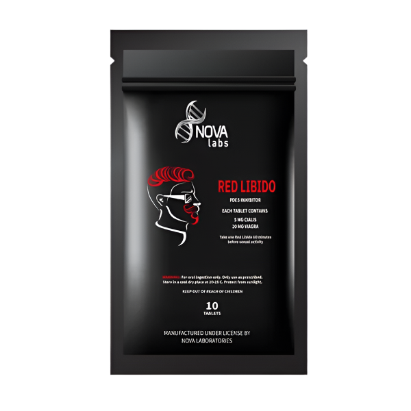 10 Tabs Nova Labs Red Libido is a blend of 5 mg Cialis (Tadalafil) and 20 mg Viagra (Sildenafil), combining two well-known medications to enhance sexual performance and support erectile function. This dual-action formula is designed for those seeking both a rapid and long-lasting effect, as Cialis provides longer-lasting effects, while Viagra offers faster-acting results.